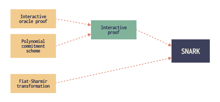- The Fiat–Shamir transformation, which wraps the other two components to produce a SNARK.